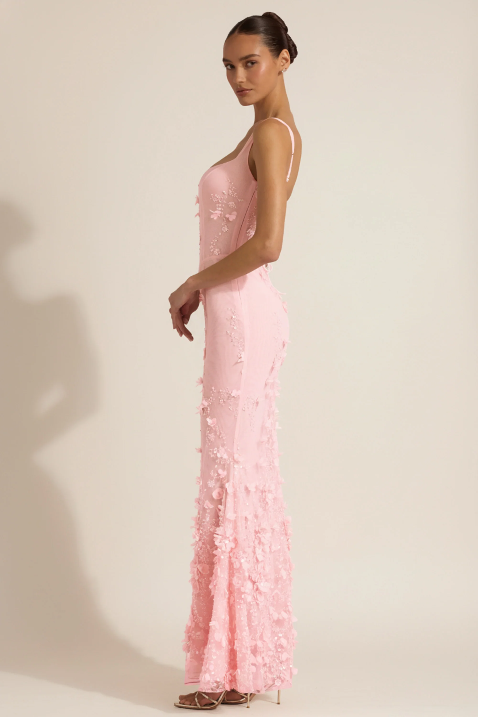 Embellished Appliqué Soft-Scoop Corset Gown in Pink
